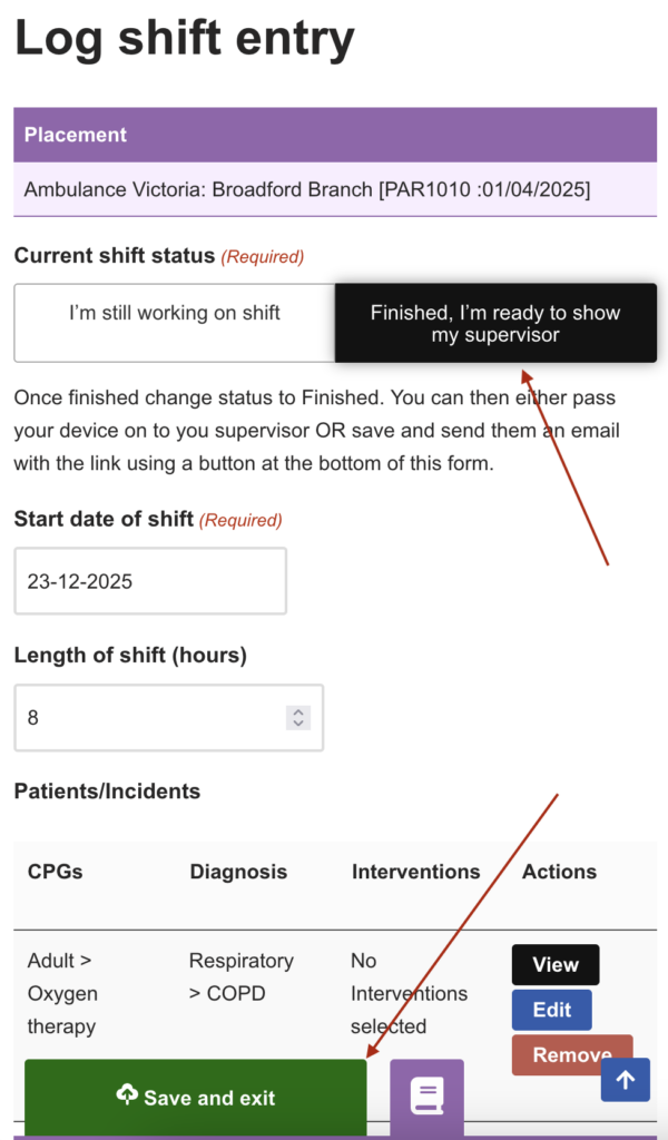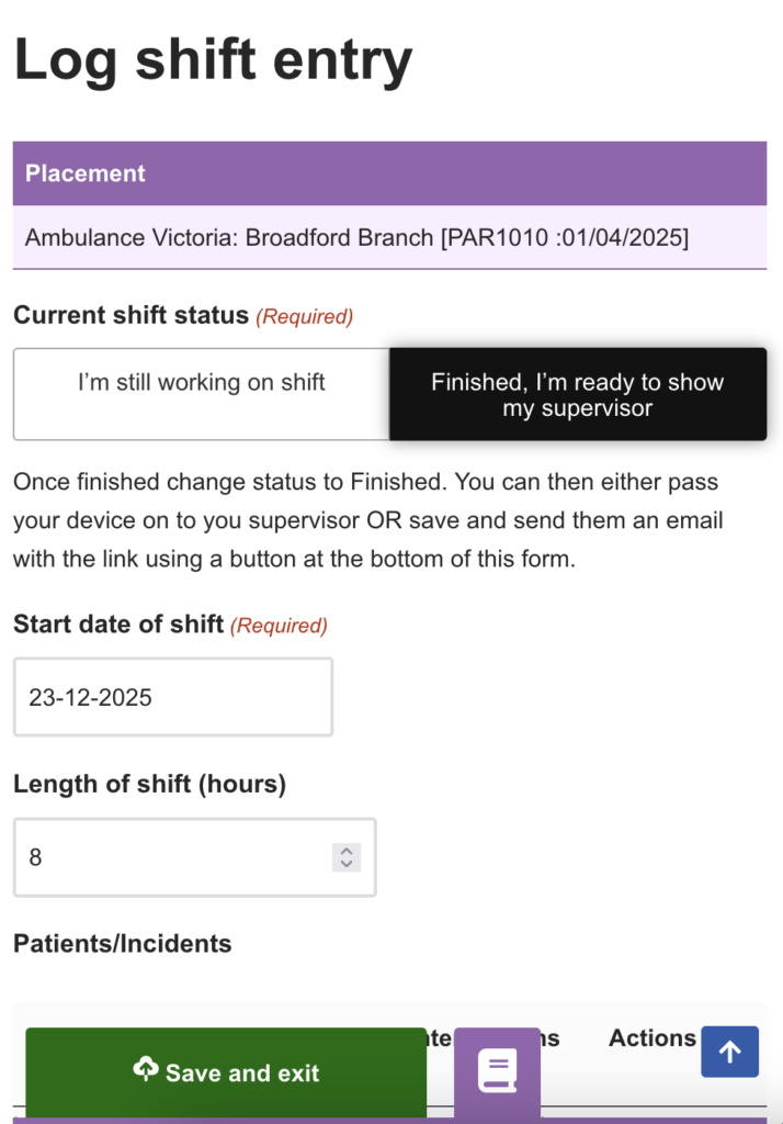 Selected the “Finished, I’m ready to show my supervisor” then click the “Save and exit” at the bottom of the screen. You will need their email address in order to send it via your student email inbox. Make sure to grab their email address before the end of your shift. You can then use the copy link button via the logbook to paste it in an email and send them an email with the link for later completion.