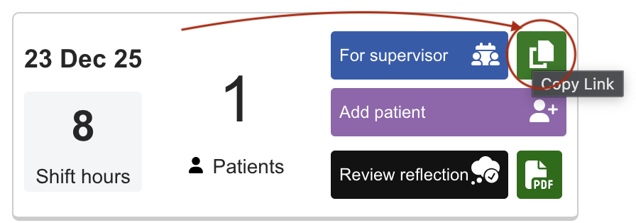 Clicking the green pdf button will download a PDF summary of the shift, patients and reflections (if any – reflections are no longer required for every shift)